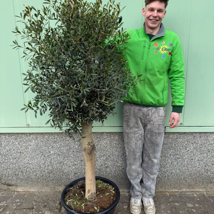 Deze robuuste olijfboom van ca. 190 cm hoog is een echte eyecatcher dankzij zijn extra dikke, karaktervolle stam. De grijsgroene bladeren in combinatie met het stoere silhouet geven direct een mediterraan gevoel aan je tuin, balkon of terras. Met zijn brede potmaat van 45 cm staat deze boom stevig en straalt hij luxe en rust uit.