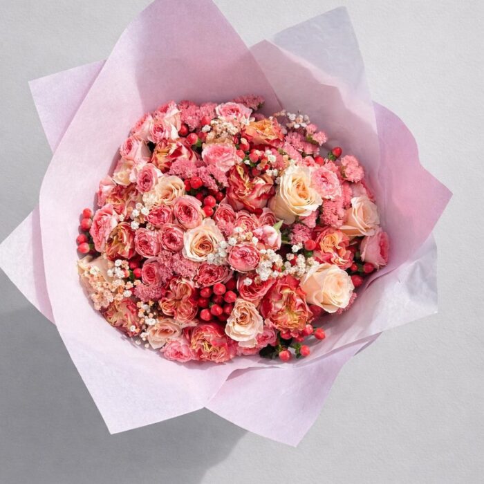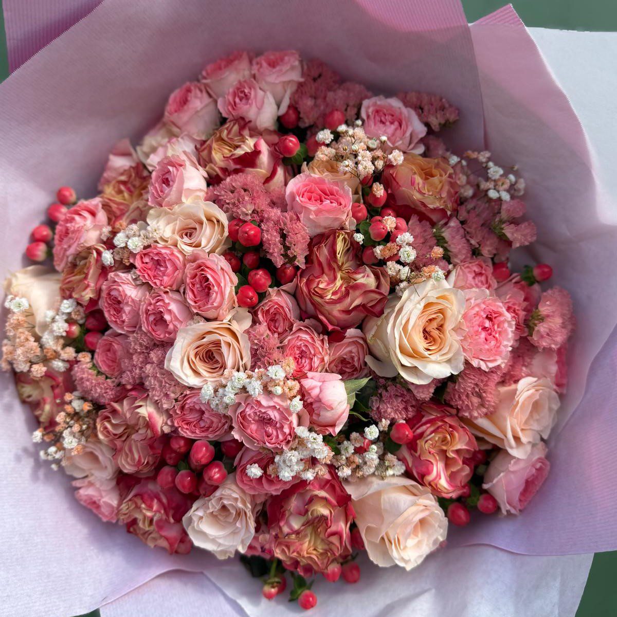 Het boeket Wonderful Wow is een boeket samengesteld uit diverse grootbloemige rozen, trosrozen, roze gipskruid en hypericum.